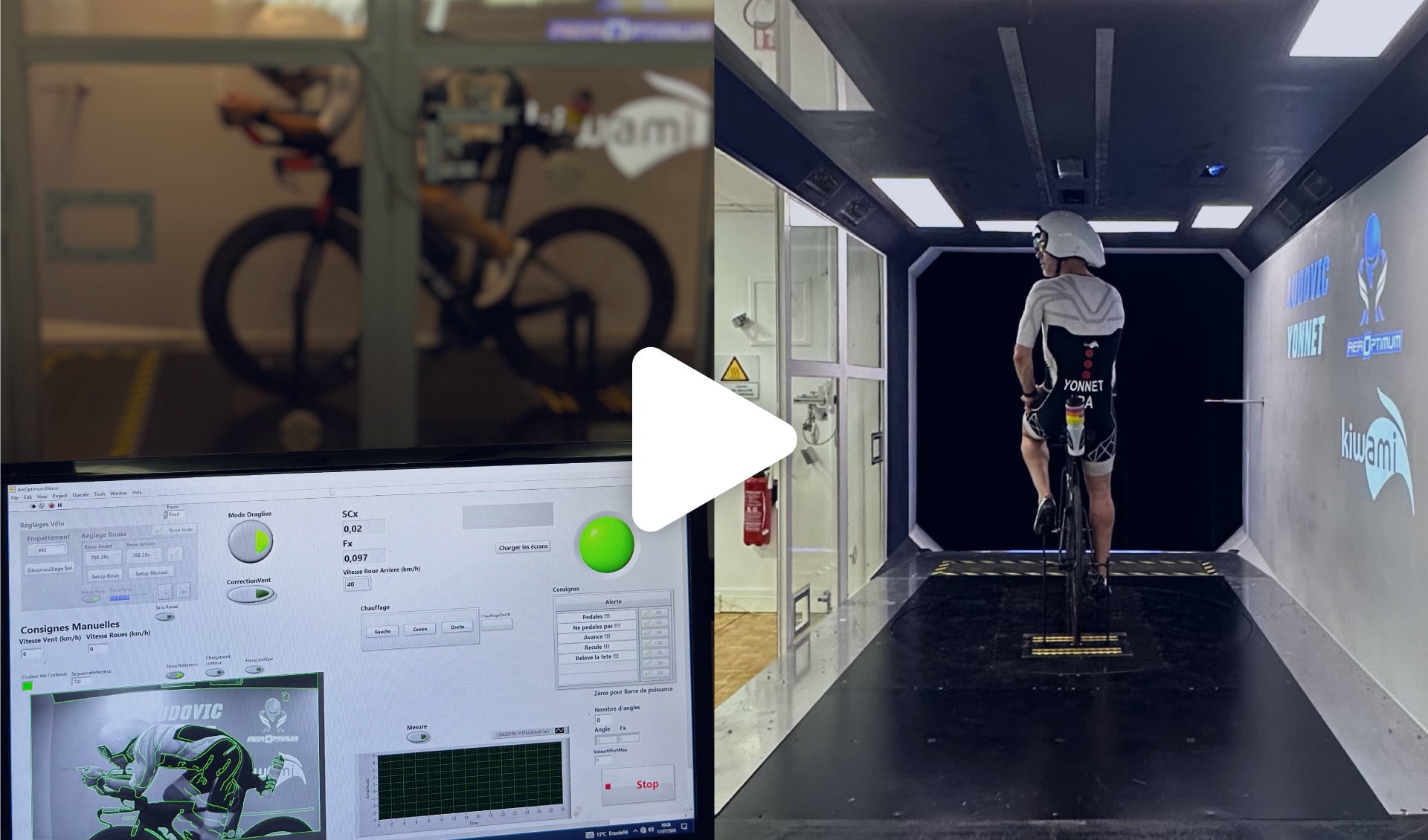 Les tests en soufflerie ont été réalisés chez AerOptimum (Magny-Cours) pour obtenir des données sur la puissance aérodynamique, les gains en temps de nos différents prototypes et ainsi les comparer aux trifonctions du marché.